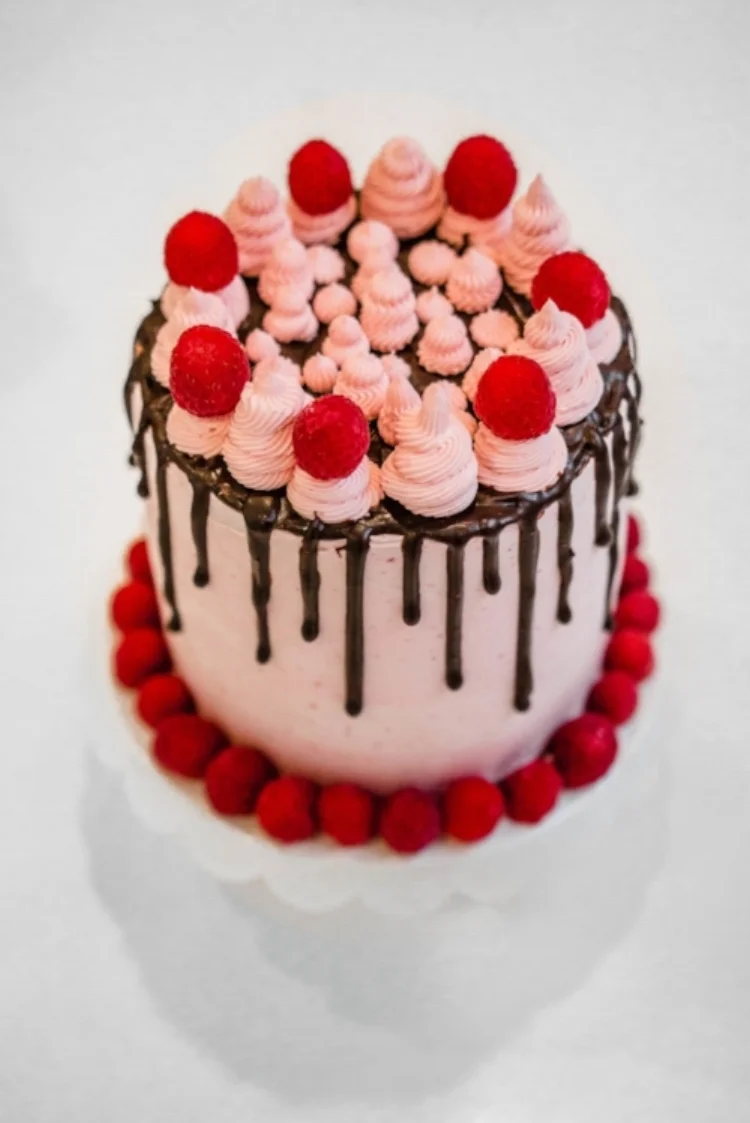 a crustless cheesecake, sandwiched between 2 chocolate cakes, layered with a seedless raspberry compote, chocolate ganache, and finished with a raspberry swiss meringue buttercream.